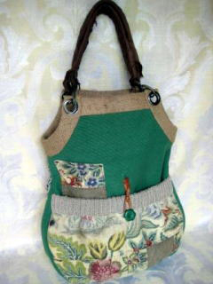 後ろ面はハギレを組み合わせ、麻ニットの口布で、実用性の中にもほのぼのとした表情が見えるようにしました。